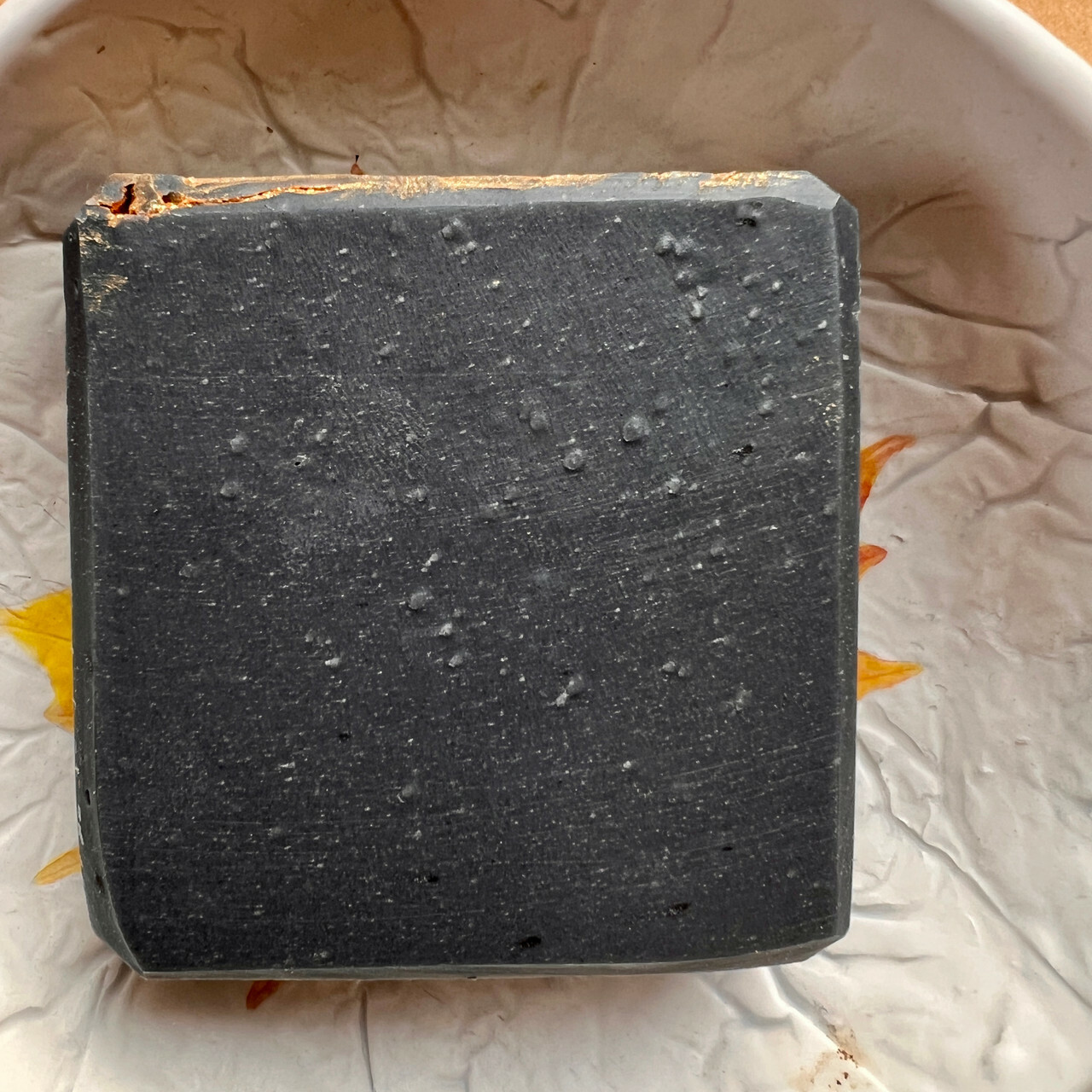 100% Saponified Longest Acres Farm Lard (Chelsea, VT), Organic Olive Oil infused in homegrown calendula for 8 weeks, Organic Coconut Oil, Organic Shea Butter, Organic Castor Oil, Essential Oil Blend (Benzoin, Cedarwood, Birch Tar), Activated Charcoal